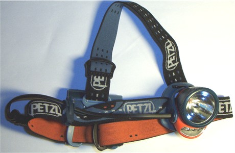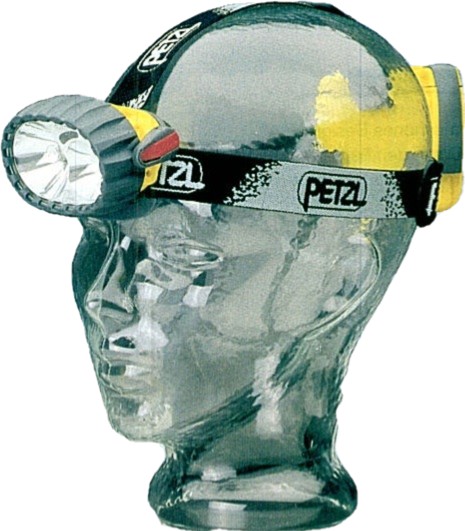 Vor einigen Jahren habe auch ich mir eine solche Lampe zugelegt: Eine PETZL DUO. Diese Lampe besitzt zwei Glühbirnen. Eine sparsame Kryptonbirne (12 h Betrieb) und eine Halogenbirne für die Ferne (4,5 h Betrieb). Der Lichtstrahl der Halogenbirne lässt sich fokussieren und der Leuchtwinkel lässt sich verstellen, so dass man auch ohne Verrenkungen den Haken sehen kann, den man gerade vor seinem Bauch anknotet. Die Lampe ist spritzwassergeschützt und wie gesagt absolut zuverlässig. Der leichtgängige Schalter hat eine Sperre gegen Anschalten der Lamppe im Rucksack und wenn wirklich mal eine Glühlampe den geist aufgeben sollte (ist mir noch nicht passiert) und man steht irgendwo in der Walachei schaltet man mit einem Handgriff auf die anderen Birne um und findet den Weg nach Hause. Wenn man eine zweite Lichtquelle dabei hat, kann man auch die Lampe öffnen, eine der zwei Ersatzbirnen einsetzen und weiter geht´s. Die Lampe ist durch die breiten weichen Riemen sehr bequem zu tragen und dadurch, dass die vier Mignonzellen am Hinterkopf angebracht sind, auch sehr gut ausbalanciert.